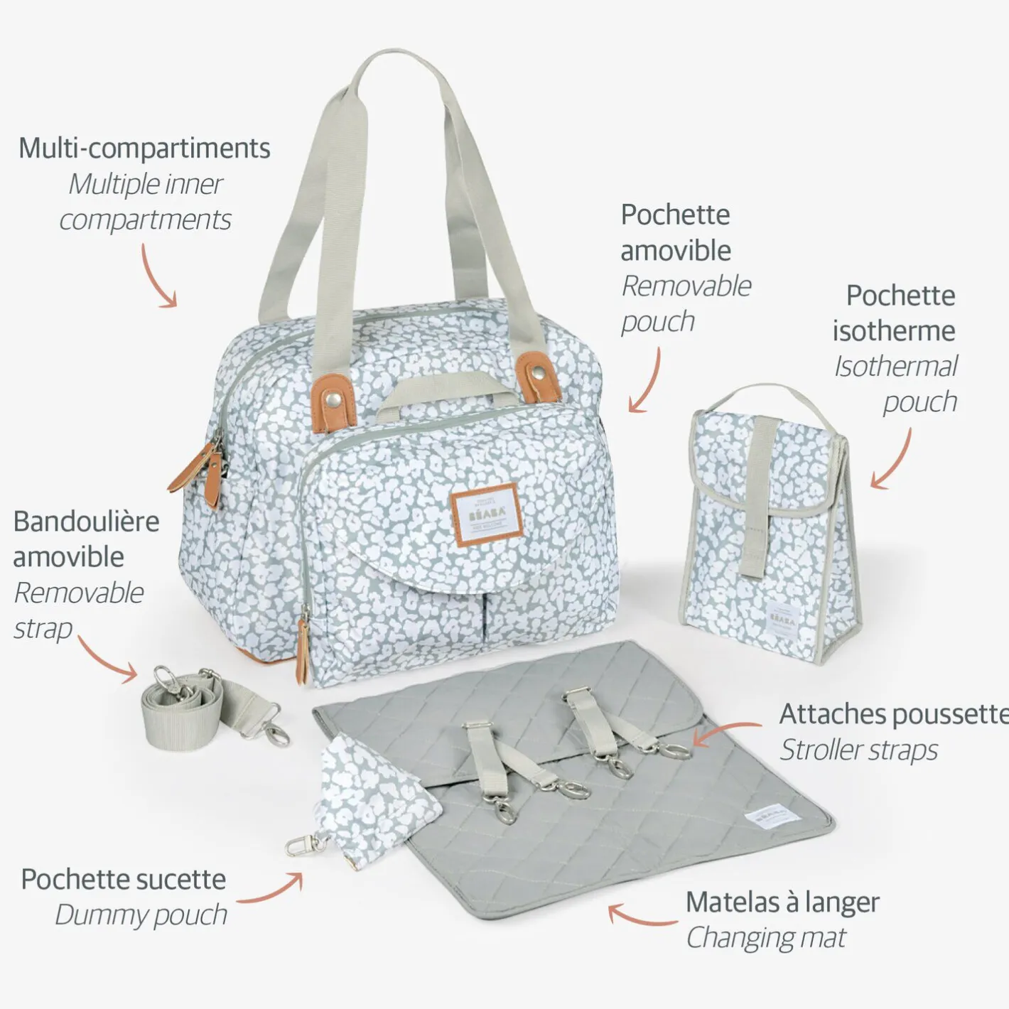 Sa grande contenance permet de transporter tout le nécessaire pour bébé et les parents, tout en gardant un style moderne. Le sac dispose d’un système d’attache poussette intégré, s’adaptant à la plupart des modèles de poussettes pour une utilisation pratique et mains libres. La pochette avant est amovible et offre une flexibilité supplémentaire pour un rangement adapté aux besoins du moment. Avec sa longue bandoulière amovible, le sac peut être porté confortablement à l’épaule. De plus, il est équipé d’un système d’accroche trolley, idéal pour les voyages, permettant de le fixer sur la poignée rétractable d’une valise. L’intérieur du sac est conçu pour une organisation optimale grâce à ses multiples rangements. Vous pouvez y transporter aisément les affaires de bébé ainsi que celles des parents. La pochette repas isotherme intégrée permet de conserver les aliments de bébé à la bonne température, qu’ils soient chauds ou froids.