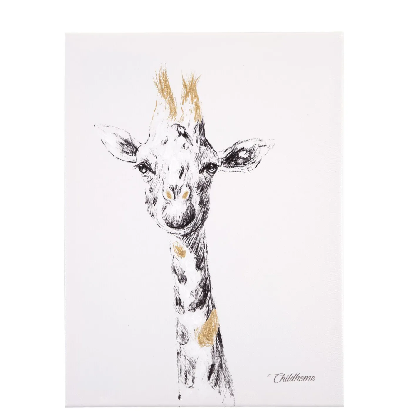 Cette belle peinture d’une girafe a des détails dorés élégants. C’est la décoration parfaite pour une chambre d’enfant tendance. Complétez-le avec les peintures assorties d’éléphants et de zèbres !