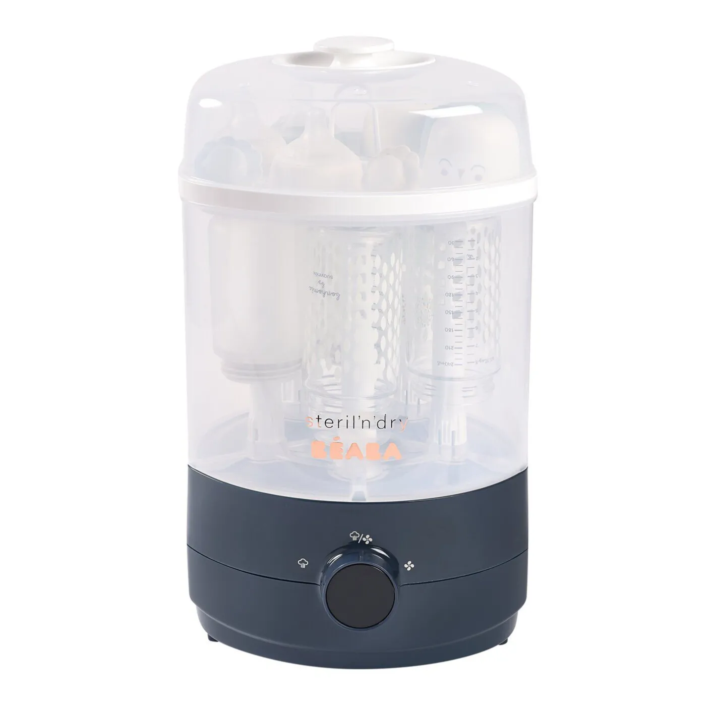 Sa grande capacité permet de stériliser jusqu’à 6 biberons et des accessoires (tétines, sucettes, pièces de tire-lait). Le stérilisateur séchant 2 en 1 Steril N Dry comprend deux compartiments modulables. Il peut s’utiliser en mode maxi pour les biberons de toutes tailles et en mode mini pour les tétines, sucettes et autres petits accessoires (possibilité de l’utiliser avec les deux compartiments ou un seul). Flexibles, les supports pour biberons sont amovibles afin de pouvoir en mettre moins et ainsi s’adapter à de plus grands éléments.